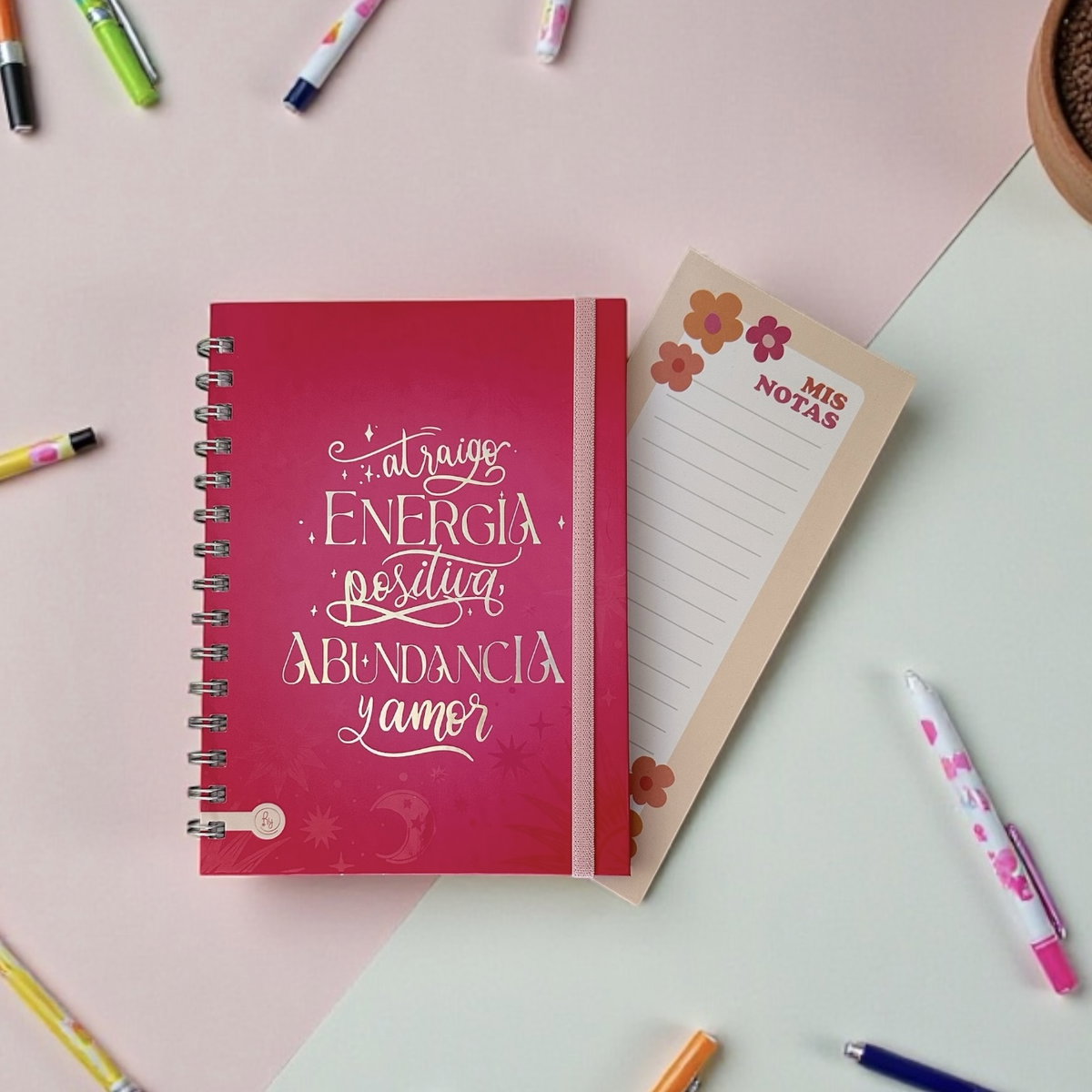 Combo anotador anillado + Botella + Refrinotas que te permiten adherirlas a la heladera por su practico imán posterior
