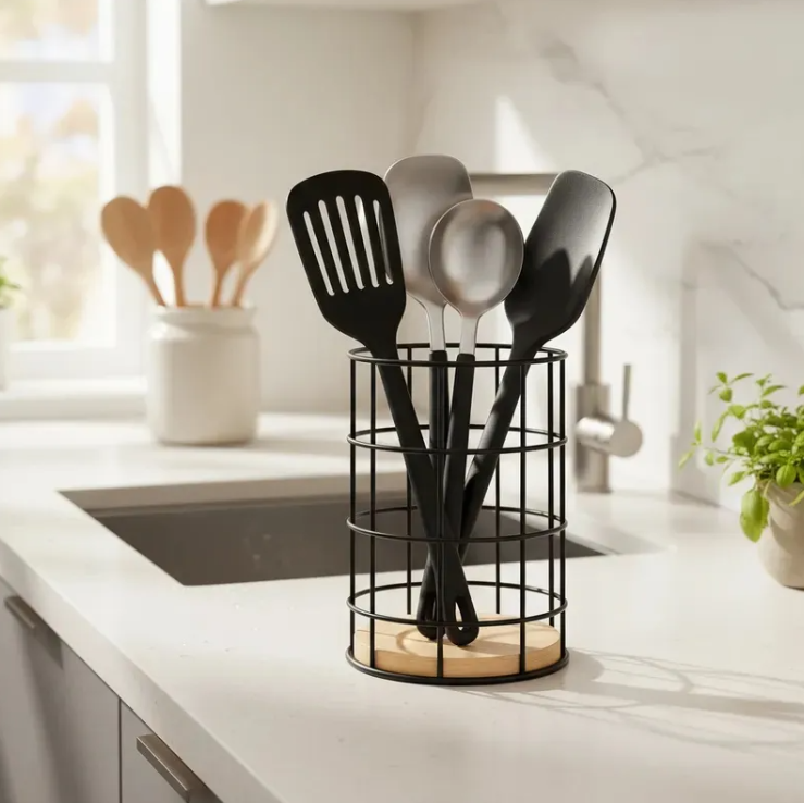 Organiza tus cubiertos de manera elegante y funcional; fabricado en hierro, ofrece un diseño moderno que se adapta a cualquier estilo de cocina. Mantene tus utensilios al alcance de la mano sin ocupar demasiado espacio.